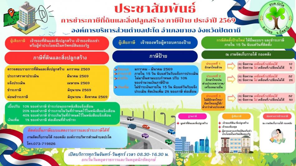 ประชาสัมพันธ์ การชำระภาษีที่ดินและสิ่งปลูกสร้าง และภาษีป้าย ประจำปี 2569 ติดต่อสอบถามข้อมูลเพิ่มเติมได้ที่งานจัดเก็บรายได้ กองคลัง อบต.ปะโด